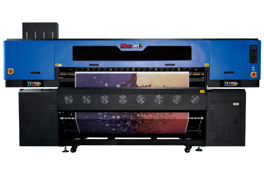 Projetada para trabalhar com mídias de até 195 cm de largura, a TX1908y-PRO suporta rolos pesados de até 120 kg, oferecendo estabilidade e robustez para uso contínuo no ambiente industrial. Compatível com tintas sublimáticas MicroInk, é ideal para impressão em papel e transferência térmica, atendendo com eficiência setores como comunicação visual, estamparia têxtil e produção em larga escala. Seu sistema avançado de secagem, com ventiladores InfraRed e enrolador pneumático, assegura melhor acabamento e maior fluidez no fluxo de trabalho.